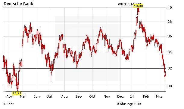 Die charttechnische Situation bei der Deutschen Bank hat sich am Montag etwas verbessert. Das Papier notiert am Nachmittag mit einem Prozent im Plus bei 31,37 Euro. Von einer nachhaltigen Erholung kann man aber nicht sprechen. Fakt ist: Die Deutsche-Bank-Aktie ist mit einem 2014er-KGV von 10 sowohl im historischen als auch im Branchenvergleich zu günstig bewertet. Allerdings wird es wohl sehr lange dauern, bis die Aktie ihre Unterbewertung komplett abgebaut sein wird. Investierte Anleger beachten den Stoppkurs bei 30,50 Euro.