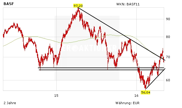 Auch DER AKTIONÄR bleibt für die BASF-Titel zuversichtlich gestimmt. Nachdem der Kurs wieder unter den langfristigen Abwärtstrend gerutscht ist, besteht für einen Einstieg keine Eile. Vielmehr sollte abgewartet werden, dass die Aktie im Bereich von 64 bis 65 Euro einen Boden ausbildet. Wer bereits investiert ist, beachtet den Stopp bei 55,50 Euro.