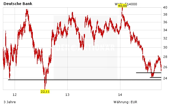 Sollte die Aktie ein neues Tief markieren, droht ein Rücksetzer zunächst bis 23,80 Euro, dem Tief von November 2011. Gibt es auch hier kein Comeback, wartet auf die Deutsche-Bank-Aktionäre ein Absturz in den Bereich des Julitiefs von 2012 bei 22,11 Euro.
