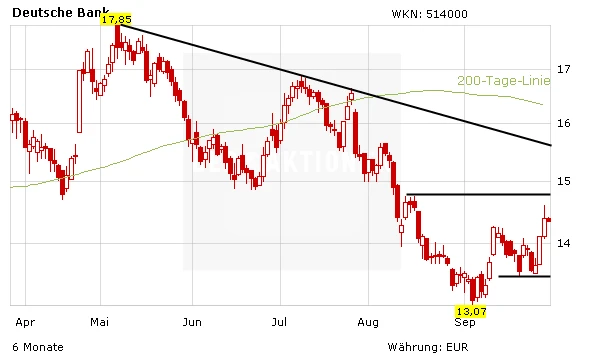 In der laufenden Woche haben ein positiver Gesamtmarkt und steigende Renditen an den Anleihemärkten für Kursrückenwind gesorgt. Die geschäftliche Lage bei der Deutschen Bank bleibt schwierig, die Charttechnik hat sich zuletzt allerdings verbessert. Setzt sich die Aufwärtsbewegung fort, kommt als nächstes der waagrechte Widerstand bei 14,89 Euro in den Fokus. Die wichtige 200-Tage-Linie bei derzeit 15,68 Euro ist jedoch noch einige Zähler entfernt. Dort verläuft um 15,72 Euro auch der mittelfristige Abwärtstrend. Eine Unterstützung befindet sich dagegen bei 13,42 Euro.