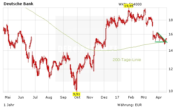 Mit der jüngsten Kapitalerhöhung und einer harten Kernkapitalquote von mehr als 14 Prozent ist die Millionenstrafe für die Deutsche Bank kein Problem. Die Aktie ist erst gestern aus dem kurzfristigen Abwärtstrend bei 15,39 Euro nach oben ausgebrochen. Legt der Kurs weiter zu, kommt als nächstes der horizontale Widerstand bei 15,65 Euro in den Fokus. Eine Unterstützung befindet sich im Bereich von 15,20 Euro.