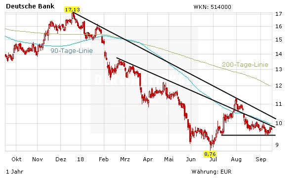Die Aktie der Deutschen Bank hängt derzeit zwischen 9,46 Euro und 10-Euro-Marke gefangen. Selbst ein Ausbruch nach oben würde wohl schnell bei 10,30 Euro wieder ins Stocken geraten. Dort verläuft der Abwärtstrend seit vergangenem Dezember. Angesichts der nach wie vor im Umbau befindlichen Bank drängt sich ein Investment weiterhin nicht auf.