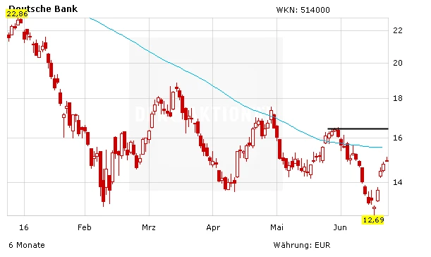 Die Aktie der Deutschen Bank setzt ihre Kurserholung auch am Mittwoch fort. Im frühen Handel steigt der Titel über die 15-Euro-Marke. Als nächster Widerstand wartet nun die 90-Tage-Linie bei 15,56 Euro. Wird diese Marke geknackt, rückt als nächster Widerstand das Hoch von Anfang Juni bei 16,39 Euro in den Fokus.