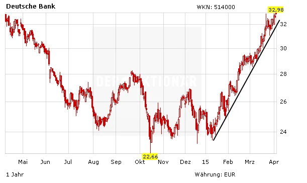 Charttechnisch sieht es weiterhin mehr als gut aus für die Deutsche Bank. Die Aktie ist drauf und dran, einen sehr bedeutenden Widerstand zu überwinden, nämlich den seit 2008 gültigen Abwärtstrend zu knacken. Dieser verläuft aktuell bei 33,60 Euro, es fehlen also nur noch zwei Prozent.
