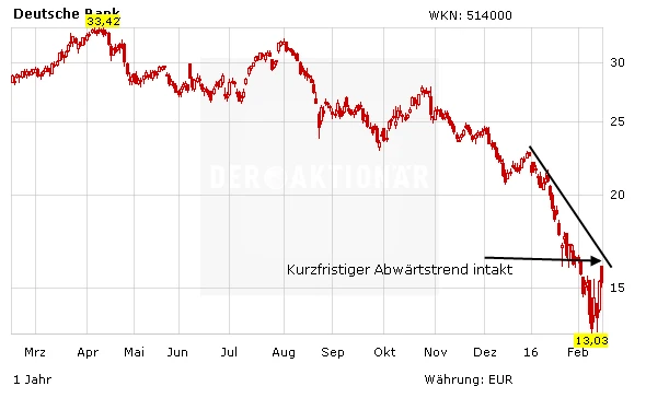 JPMorgan sieht den fairen Wert der Aktie nicht mehr bei 28 Euro, aber immerhin noch bei 24 Euro. Das entspricht aber einem immensen Kurspotenzial von 57 Prozent. JPMorgan-Analyst Kian Abouhossein stuft die Deutsche Bank weiterhin mit "Übergewichten" ein.