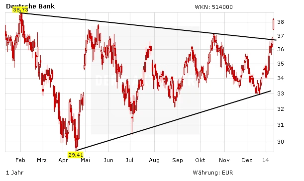 Die neue Handelswoche startet mit kräftigen Kursgewinnen bei der Deutschen Bank. Am Morgen notiert die Aktie mit einem Plus von drei Prozent auf 37,94 Euro. Damit hat der kurzfristige Aufwärtstrend noch einmal Dynamik aufgenommen. Der Ausbruch aus der zähen Keilformation ist damit gelungen. Jetzt muss sich zeigen, ob der Ausbruch nachhaltig sein wird.