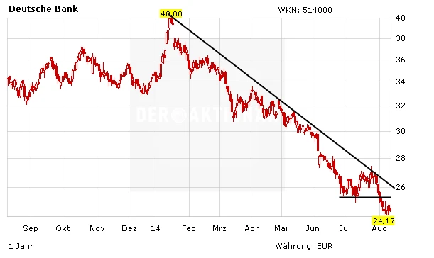 Die Situation bei der Deutschen Bank ist kompliziert. Auf der einen Seite ist die Aktie mit einem 2015er-KGV von 9 sehr günstig bewertet – sowohl im historischen Vergleich als auch im Vergleich mit der Branche. Auf der anderen Seite belasten vor allem die Rechtsstreitigkeiten den Kurs. Niemand weiß, wie viel die Prozesse die Deutsche Bank noch kosten werden. Fazit: Wer mutig ist, kann die günstige Bewertung zum Einstieg nutzen. Der Stopp sollte bei 20,50 Euro gesetzt werden.