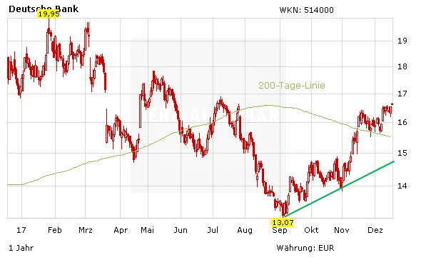 Die Aktie der Deutschen Bank ist mit einem 2018er-KGV von 12 etwas günstiger bewertet als das Mittel der Peergroup mit 13. Das Kurs-Buchwert-Verhältnis von 0,5 deutet zudem auf eine Unterbewertung hin. Das Chartbild präsentierte sich zuletzt auch stark. DER AKTIONÄR hält an seiner Kaufempfehlung fest. Das Kursziel beträgt 20,00 Euro bei einem Stopp von 14,50 Euro.