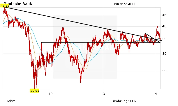 Auch charttechnisch ist zunächst Ernüchterung eingekehrt. Nach einem hoffnungsvollen 20-prozentigen Run der Aktie ist ein Großteil der Gewinne wieder aufgezehrt. Idealtypisch verläuft eine Korrektur eines solchen Anstieg weniger stark und unter geringerem Handelsvolumen. Dennoch besteht noch Hoffnung auf eine Fortsetzung des Ausbruchversuchs: Die Aktie notiert weiter über dem eingezeichneten Trend und die massive Unterstützung bei 34 Euro sichert nach unten ab.