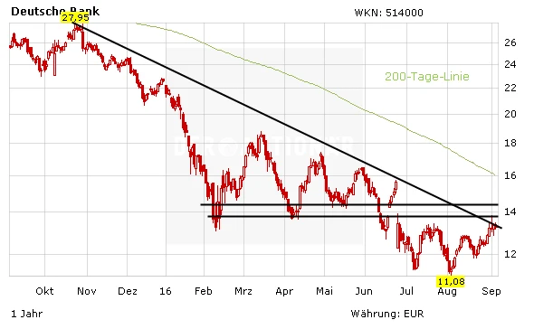 Zwar hat sich der Kurs der Deutsche Bank-Aktie zuletzt erholt, die strukturellen Probleme sind aber immer noch nicht gelöst. Mit einem Kurs-Buchwert-Verhältnis von nur noch 0,3 ist die Aktie im Branchenvergleich sehr günstig bewertet. Allerdings kann ein niedriger Wert bei der Kennzahl auch ein Hinweis darauf sein, dass die Anleger der Bilanzqualität des Unternehmens nicht trauen. Für langfristig-orientierte Anleger ist die Aktie deshalb noch immer ein No-go. Trader können auf den Schluss des Gaps bei 13,90/15,00 Euro setzen.