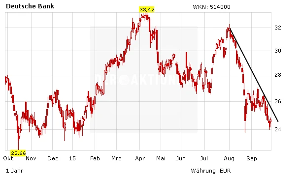 Die Aktie der Deutschen Bank ist charttechnisch angeschlagen. Der kurzfristige Abwärtstrend ist intakt, das 6-Monats-Tief nicht weit entfernt. Klar, die Aktie ist günstig zu haben. Doch solange die Nervosität nicht aus dem Markt verschwunden ist, wird sich an der charttechnischen Lage nicht groß etwas ändern. Anleger sollten mit einem Einstieg abwarten.