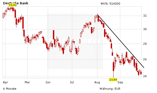 Der neue Ärger mit der Justiz belastet die eh schon miese Stimmung im Markt weiter. Die Aktie der Deutsche Bank knickt am Montag um 1,8 Prozent auf 24,22 Euro ein. Das Chartbild ist angeschlagen, der kurzfristige Abwärtstrend gewinnt an Dynamik. Solange sich das Marktsentiment sich nicht bessert, wird mit der Deutschen-Bank-Aktie kein Staat zu machen sein. Abwarten!