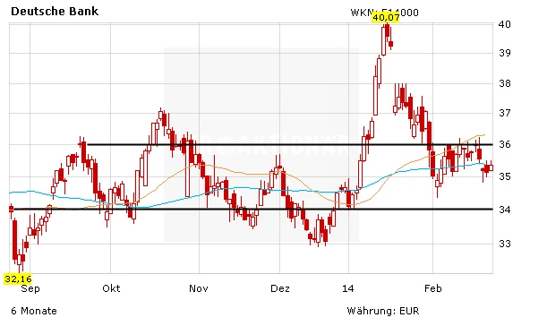 Die Deutsche-Bank-Aktie notiert am Montag zur Eröffnung leicht im Plus. Trader warten jedoch die Zurückeroberung der 36-Euro-Marke ab. Nur geduldige Anleger steigen schon jetzt ein und setzen den Stopp bei 30,50 Euro.