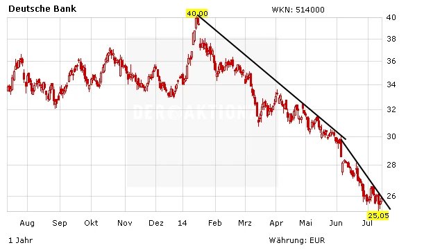 DER AKTIONÄR und viele Analysten halten die Prozessrisiken für besonders Kurs belastend. Gegen das Unternehmen wird unter anderem wegen des Libor-Skandals und wegen Absprachen im Devisenhandel ermittelt. Möglicherweise muss die Deutsche Bank zehn Milliarden Euro an Strafen bezahlen. Die Ergebnisse der Verhandlungen werden in ein bis drei Jahren erwartet. Sobald sich hier Lösungen abzeichnen, wird die Aktie den Markt schlagen. Mutige Anleger steigen ein und setzen den Stoppkurs bei 20,50 Euro.