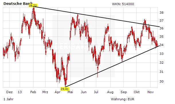 Die Deutsche-Bank-Aktie verliert im frühen Dienstaghandel 0,4 Prozent und rutscht unter die Marke von 34 Euro. Am Montag war der Wert noch mit einem Plus von 0,8 Prozent aus dem Handel gegangen. Seitdem das neue Duo Jürgen Fitschen und Anshu Jain an der Spitze des Konzerns steht, seit 1. Juni 2012, hat die Deutsche-Bank-Aktie 17 Prozent zugelegt. Währenddessen hat der DAX 47 Prozent zugelegt.