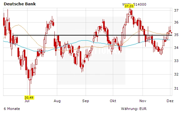 Derweil hat sich die charttechnische Situation bei der Deutschen Bank verbessert. Nachdem der Sprung über die 35-Euro-Marke gelungen ist, rückt nun der Bereich bei 36,50 Euro in den Fokus. Gelingt ein nachhaltiger Ausbruch, würde die Aktie ein klares Kaufsignal generieren.