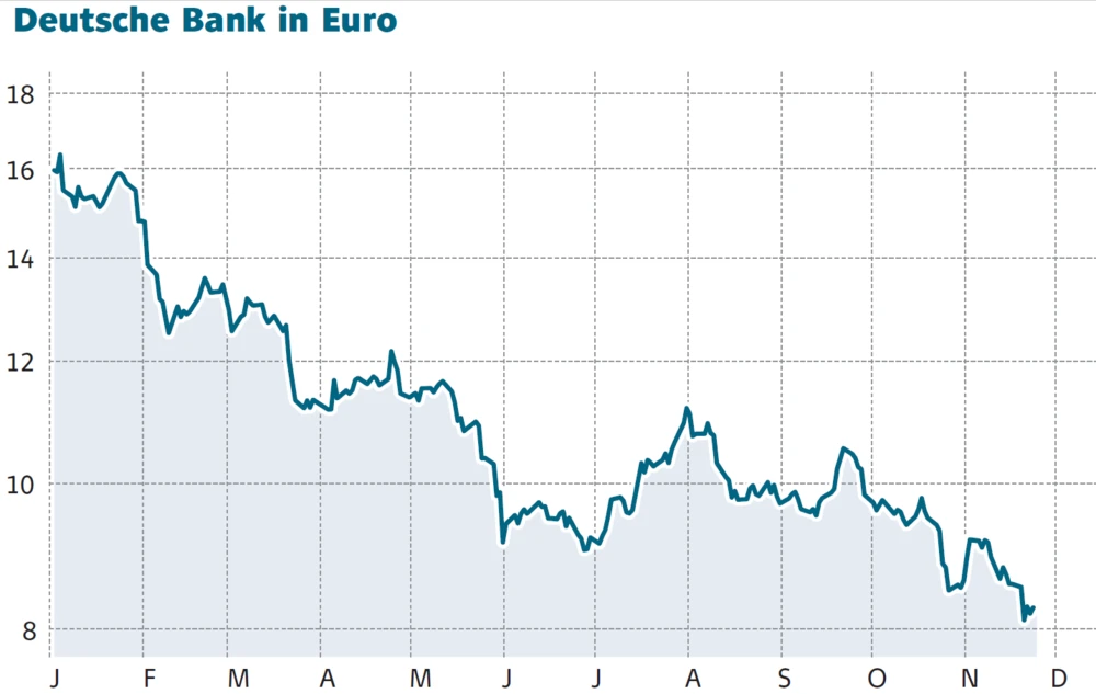 Gerade die Deutsche Bank steckt im Schlamassel. Nach drei Geschäftsjahren mit Milliarden-Verlusten muss der Bankenprimus die Kosten massiv senken und gleichzeitig das Geschäft auf neue, stabile Beine stellen. Die teure Umstrukturierung dauert länger als erwartet. Milliarden-Strafzahlungen drückten zusätzlich auf die Erträge. Die Bank ist in einer Abwärtsspirale gefangen.