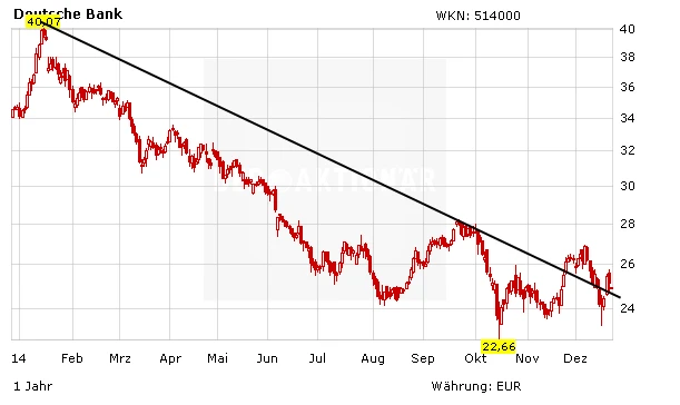 Die Aktie der Deutschen Bank notiert am Montagmorgen leicht im Minus. Allerdings hält sich der Titel über dem von Januar an gültigen Abwärtstrend. Nachhaltigen Auftrieb für den ganzen Sektor könnte es schon bald durch Mario Draghi geben. Der EZB-Präsident wird sich mit dem Start des QE-Programms gewiss nicht mehr allzu viel Zeit lassen. DER AKTIONÄR sieht den fairen Wert der Deutschen-Bank-Aktie bei 33 Euro. Der Stopp sollte bei 21,50 Euro gesetzt werden.