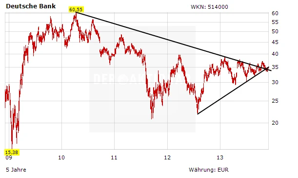 Die charttechnische Situation bei der Deutschen Bank hat sich deutlich verbessert. Das Papier notiert über der Marke von 35 Euro. Bald könnte der Ausbruch aus der Keilformation gelingen.