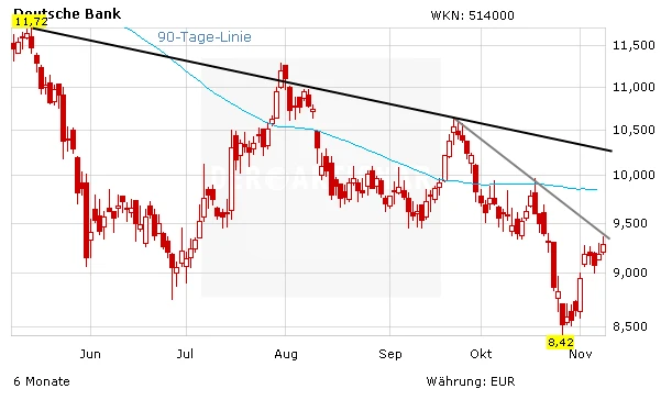 Für die CoBank spricht auch die Aktienkursentwicklung. Die Deutsche Bank hängt noch im Abwärtstrend. Die erste charttechnisch bedeutsame Hürde seit September verläuft derzeit bei 9,37 Euro, die 90-Tage-Linie liegt bei 9,85 Euro und eine mittelfristige Abwärtstrendlinie wird den Kurs der Deutschen bei 10,30 Euro behindern.