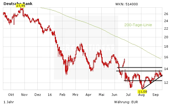 Neben der strengeren Regulierung und dem Niedrigzins-Umfeld sind die schwebenden Rechtsverfahren bei der Deutschen Bank die größten Probleme. Mit einem Kurs-Buchwert-Verhältnis von unter 0,3  sind die Titel sehr günstig bewertet. Trader können auf eine geringe Strafe für die Deutsche Bank setzen. Dann dürfte die Kurslücke bei 13,89/14,30 Euro bald geschlossen werden. Es sollte aber ein enger Stopp bei 12,40 Euro platziert werden. Alle anderen warten die Einigung ab.