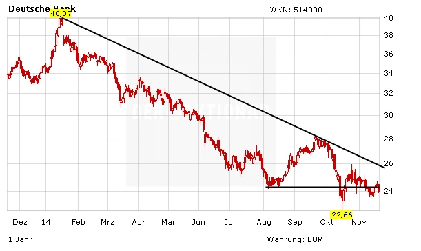 Die Aktie der Deutschen Bank fällt am Donnerstagnachmittag 2,1 Prozent auf 23,93 Euro. Das liegt allerdings nicht an den CoCo-Bonds, sondern an schwachen Wirtschaftsdaten. Laut dem Forschungsinstitut Markit ist die Stimmung in den Unternehmen der Eurozone im November überraschend auf den tiefsten Stand seit über einem Jahr gefallen. Vor allem in der größten Euro-Volkswirtschaft Deutschland trübten sich die Aussichten spürbar ein. Hier fiel der Indikator überraschend auf die Expansionsschwelle von 50 Punkten zurück.