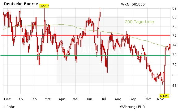 Die Aktie der Deutschen Börse konnte sich seit der Wahl von Donald Trump deutlich erholen. Der Zusammenschluss mit der London Stock Exchange ist zwar noch nicht in trockenen Tüchern, höhere Umsätze durch die Unsicherheit in den nächsten Monaten dürften den Kurs allerdings unterstützen. Zudem würde der Börsenbetreiber durch seine Tochter Clearstream von steigenden Zinsen in den USA profitieren. Im freundlichen Gesamtmarkt dürfte die 200-Tage-Linie bei 73,45 Euro bald fallen, eine Unterstützung bei 72,00 Euro sichert nach unten ab. Mit einer Dividendenrendite von drei Prozent ist der Titel günstig bewertet, Anleger greifen zu. Das Ziel des AKTIONÄR beträgt 90,00 Euro, der Stopp sollte bei 60,00 Euro platziert werden.