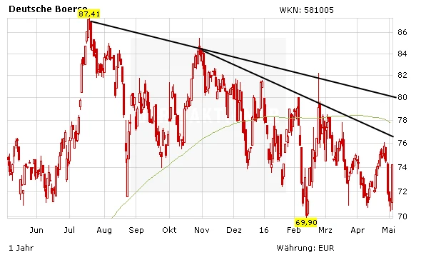 Nachdem die Aktie des Börsenbetreibers nach Vorlage der Quartalszahlen in der Vorwoche unter Druck geraten war, setzt das Papier am Mittwoch zum Rebound an. Mit einem Plus von mehr als fünf Prozent ist die Aktie zwischenzeitlich an die DAX-Spitze gesprungen. Nun rücken die 200-Tage-Linie im Bereich von 77,75 Euro sowie der Abwärtstrend wieder in den Fokus. Für konservative Anleger bleibt die Aktie ein spannendes Investment.