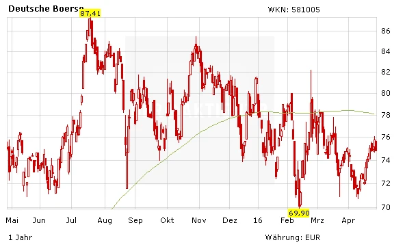 Auch wenn die Übernahme längst noch nicht in trockenen Tüchern ist, bleibt die Aktie Deutsche Börse vor allem für konservative Anleger ein interessantes Investment. Das Papier ist im Peer-Group-Vergleich günstig bewertet. Charttechnisch könnten zudem der Sprung über die 200-Tage-Linie im Bereich von 78 Euro und ein Ausbruch aus dem Abwärtstrend frische Impulse liefern.