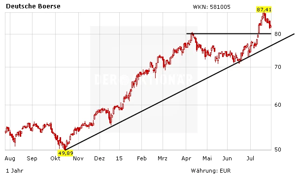 Die Aktie der Deutschen Börse befindet sich weiterhin im Aufwärtstrend. Nach dem Ausbruch über die 80-Euro-Marke hat der DAX-Titel ein neues Mehrjahreshoch markiert. Den kleinen Rücksetzer können Anleger zum Einstieg nutzen. Das Kursziel des AKTIONÄR lautet 98,50 Euro. Ein Stopp bei 73 Euro sichert die Position ab.