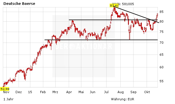 Bereits Anfang Oktober hatte eine bullishe Analystenstudie die Aktie der Deutschen Börse aus der zwischenzeitlichen Konsolidierung gerissen und für einen Kurssprung gesorgt. Im Zuge dessen gelang auch der Bruch des kurzfristigen Abwärtstrends. Seitdem ging es weiter bergauf, das Mehr-Jahres-Hoch bei 87,41 Euro ist nun wieder in Reichweite. Die Quartalszahlen am Mittwoch dürften für frische Impulse sorgen.