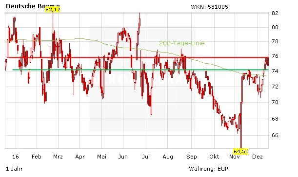 Die Aussichten für die Fusion der Deutschen Börse mit der LSE haben sich zuletzt wieder aufgehellt und auch der Aktienkurs hat seit der Wahl von Donald Trump zum US-Präsidenten die Seitwärtsrange verlassen. Steigende Zinsen und die zahlreichen Wahlen in Europa 2017 halten die Volatilität an den Märkten hoch. Für die Deutsche Börse als Marktbetreiber sind das beste Voraussetzungen. In den USA profitiert der Konzern zudem über die Tochter Clearstream direkt von den höheren Zinsen. Das erwartete KGV von 16 für 2017 ist aufgrund der Wachstumsphantasie nicht zu teuer. Anleger bekommen außerdem eine Dividendenrendite von aktuell 3,2 Prozent. Wer noch nicht investiert ist, greift zu. DER AKTIONÄR sieht ein Kursziel von 90,00 Euro, Investoren sollten bei 60,00 Euro einen Stopp platzieren.
