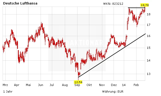 Die jüngsten News dürften den langfristigen Aufwärtstrend nicht aus dem Tritt bringen. Die Aktie sollte nach dem Kaufsignal nun schnell Kurs auf die 20-Euro-Marke nehmen. Die Deutsche Lufthansa ist mit einem KGV von 13 günstig bewertet. Investierte Anleger sichern ihre Position bei 14,50 Euro ab.