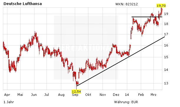 Die Papiere der Lufthansa haben sich zuletzt stark entwickelt. Für gute Stimmung unter den Marktteilnehmern sorgten zuletzt die guten Zahlen und insbesondere die Prognose auf das laufende Jahr, Ein Ende des Höhenfluges ist noch lange nicht in Sicht. Die Experten des Analysehauses Jeffries haben ihre Kaufempfehlung mit einem Kursziel von 24,00 Euro belassen.
