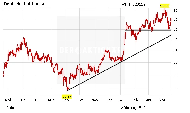 Die Papiere der Deutschen Lufthansa zählen am Dienstag zu den stärksten Titeln im DAX. Damit sollte die jüngste Schwächephase überwunden sein. Die horizontale Unterstützung bei 18 Euro hat gehalten. Ein neues Allzeithoch dürfte nur eine Frage der Zeit sein.