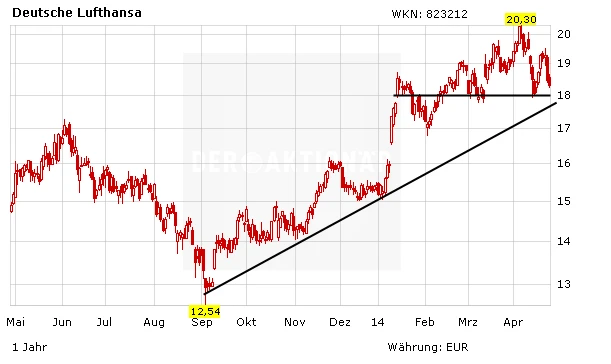 DER AKTIONÄR ist weiter optimistisch für die Lufthansa-Aktie. Investierte Anleger bleiben dabei. Aus charttechnischer Sicht muss die horizontale Unterstützung bei 18 Euro halten, fällt der Kurs darunter, droht ein weiterer Rutsch bis zur 17-Euro-Marke.