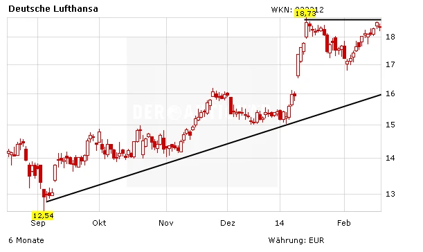 Die jüngsten News dürften den langfristigen Aufwärtstrend nicht aus dem Tritt bringen. Die Deutsche Lufthansa ist mit einem KGV von 13 günstig bewertet. Investierte Anleger sichern ihre Position bei 14,50 Euro ab.