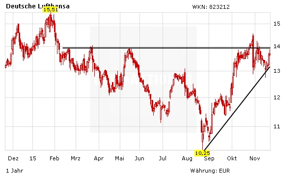 Trotz Streikbelastung und Terror-Angst hält sich die Lufthansa-Aktie weiterhin gut. Der Ausbruch über die 14-Euro-Marke ist möglich. Nach unten sichert derweil die Unterstützung bei 13 Euro ab, falls sich der Verkaufsdruck kurzfristig wieder verstärkt. Investierte Anleger bleiben an Bord, beachten aber den Stopp bei zwölf Euro.