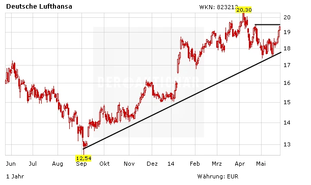 Durch das Kursplus notiert die Lufthansa-Aktie auf dem höchsten Stand seit rund einem Monat. Am Montag sorgte ein positiver Kommentar der Citigroup für Unterstützung. Das jüngste Tief bei 17,50 Euro hat sich als Boden etabliert. Mit dem Ausbruch über die 18,50-Euro-Marke wurden zahlreiche Käufer angelockt. Die Konsolidierung der vergangenen Wochen ist damit beendet. Steigt die Lufthansa-Aktie auch noch über die 19,50 Euro, ist der Weg bis zum Jahreshoch bei 20,30 Euro frei.