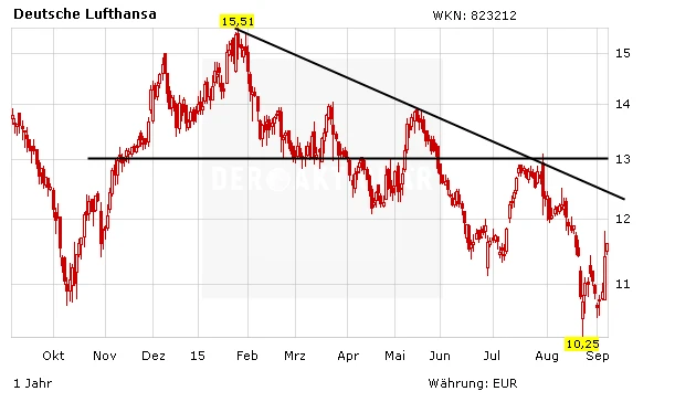 Die Analysten der Landesbank Baden-Württemberg (LBBW) haben die Airline-Aktie derweil von „Halten“ auf „Kaufen“ hochgestuft und das Kursziel von 13 auf 14 Euro angehoben. Bereits am Freitag hatte die Lufthansa-Aktie von einer positiven Analystenstudie der US-Bank Merill Lynch profitiert und rund fünf Prozent zugelegt. Im sehr schwachen Gesamtmarkt ging sie als einziger Gewinner aus dem Handel.