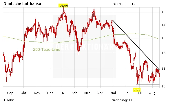 Die Talfahrt der Lufthansa-Aktie nimmt kein Ende. Am Dienstag zählt die Kranich-Airline erneut zu den schwächsten Werten im DAX. Seit dem Hoch im März hat der Titel bereits über 30 Prozent verloren. Vor allem die anhaltenden Probleme im Tarifstreit mit der Pilotengewerkschaft Vereinigung Cockpit (VC) belasten die Aktie weiterhin.