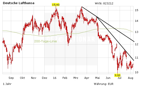 Im freundlichen Marktumfeld legt die Aktie der Deutschen Lufthansa am Montag zu. Seit dem Hoch im März hat die Aktie allerdings 30 Prozent an Wert verloren. Nachdem der DAX-Titel in der vergangenen Woche das 52-Wochen-Tief getestet hat, startet nun der nächste Versuch, aus dem steilen Abwärtstrend auszubrechen.