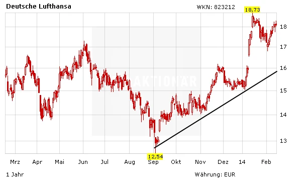 Ausgelöst wurde die jüngste Rallye der Deutschen Lufthansa von den optimistischen Aussagen der Vorstandsetage. So dürften im laufenden Jahr geringere Treibstoffkosten als im Vorjahr anfallen. Der Vorstand geht von einer Kerosinrechnung im Bereich von 6,9 Milliarden Euro aus, rund 200 Millionen Euro weniger als im abgelaufenen Jahr. Auch die Führungsfrage ist bei der Kranichairline endlich geklärt. Anfang Mai tritt Carsten Spohr die Nachfolge von Christoph Franz an. Spohr ist ein ehemaliger Pilot und der bisherige Chef der Passagiersparte bei Deutschlands größter Airline und daher für den Posten bestens geeignet.