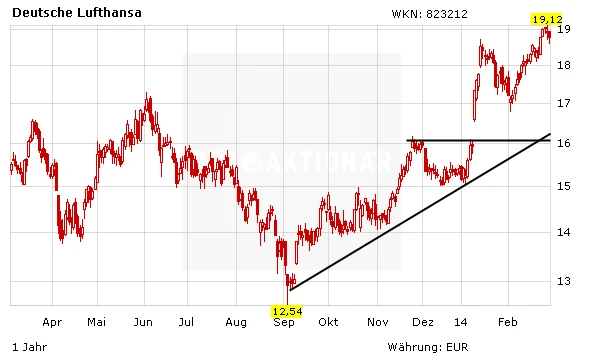 Die Papiere der Deutschen Lufthansa sind zuletzt über das alte Bewegungshoch bei 18,78 Euro ausgebrochen und haben mit Kursen über der 19-Euro-Marke ein neues Mehrjahreshoch markiert.