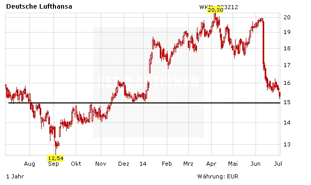 Seit der Prognosekürzung Anfang Juni ist die Aktie massiv unter die Räder gekommen. Die charttechnische Situation der Lufthansa-Aktie hat sich dramatisch verschlechtert. Der nächste Widerstand wartet bei der 15-Euro-Marke. Vor einem Einstieg sollten Anleger eine Stabilisierung des Kurses abwarten und nicht in das fallende Messer greifen.