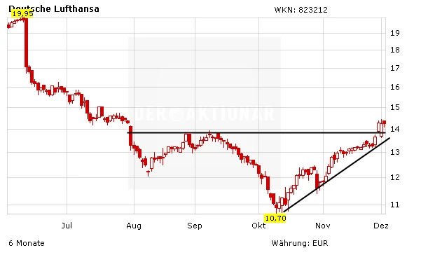 Die Aktie der Deutschen Lufthansa zeigt sich von den erneuten Streikankündigungen allerdings kaum bewegt. In einem positiven Marktumfeld kletterte der Titel zuletzt wieder über die 14-Euro-Marke und konnte diesen Bereich bislang verteidigen. Damit hellt sich auch das Chartbild deutlich auf. DER AKTIONÄR spekuliert aktuell im Derivate-Musterdepot mit einem Turbo-Bull WKN CZ3 TTM auf eine weitere Erholung bei der Lufthansa-Aktie.
