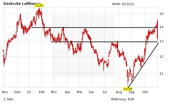 Die Lufthansa hat die Streiks bisher gut verkraftet. An der Börse sind die guten Zahlen inzwischen aber eingepreist. In der Zukunft wird es spannend, wie der Konzern auf den schwelenden Tarifkonflikt, möglicherweise steigende Ölpreise und den harten Wettbewerb mit arabischen Langstreckenfliegern und europäischen Billigfliegern reagieren wird. Trotz des Rücksetzers macht die jüngste Entwicklung Hoffnung, dass sich der Konzern auf einem guten Weg befindet. Eine erneute Erholung der Aktie sollte möglich sein. Investierte Anleger beachten aber den Stopp bei 12,00 Euro.