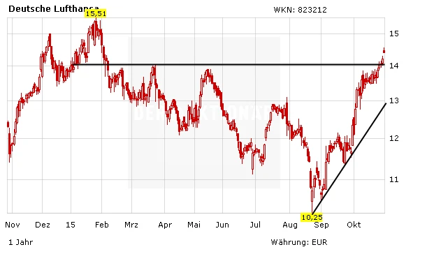 In den vergangenen Monaten hat sich die Aktie der Lufthansa glänzend entwickelt. Durch den überraschend deutlichen Rücksetzer am Donnerstag ist der Kurs zwar wieder unter die 14-Euro-Marke gefallen. Dennoch bleibt DER AKTIONÄR optimistisch, dass es bald zu einer neuen Attacke in Richtung des Jahreshochs bei 15,51 Euro kommen dürfte. Nach unten sollte die Position mit einem Stopp bei zwölf Euro abgesichert werden.