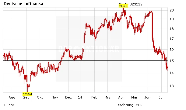 Zwischenzeitlich ist auf ein neues Mehrmonatstief gefallen. Für schlechte Stimmung sorgen negative Analystenkommentare. So hat die Schweizer Großbank in ihrer jüngsten Studie die Lufthansa-Aktie von „Buy“ auf „Neutral“ herabgestuft. Den fairen Wert für Lufthansa beziffert Analyst Jarrod Castle nun mit 15,25 statt mit 18 Euro. Die Investoren dürften sich den Papieren erst nach dem tatsächlichen Erfüllen der Unternehmensplanung wieder zuwenden, so Castle. Vergangene Woche hatte die Lufthansa ihre neue Strategie samt größerem Billigangebot vorgestellt.