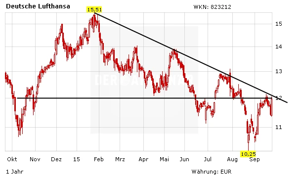 Die Lage bei der Lufthansa bessert sich langsam, bleibt aber angespannt. Mit dem Sprung über die 12-Euro-Marke würde sich die charttechnische Situation deutlich aufhellen, denn im Bereich dieses Widerstands verläuft auch der mittelfristige Abwärtstrend. Erst wenn diese wichtige Marke nachhaltig übersprungen ist, sollten Anleger den Einstieg wagen.